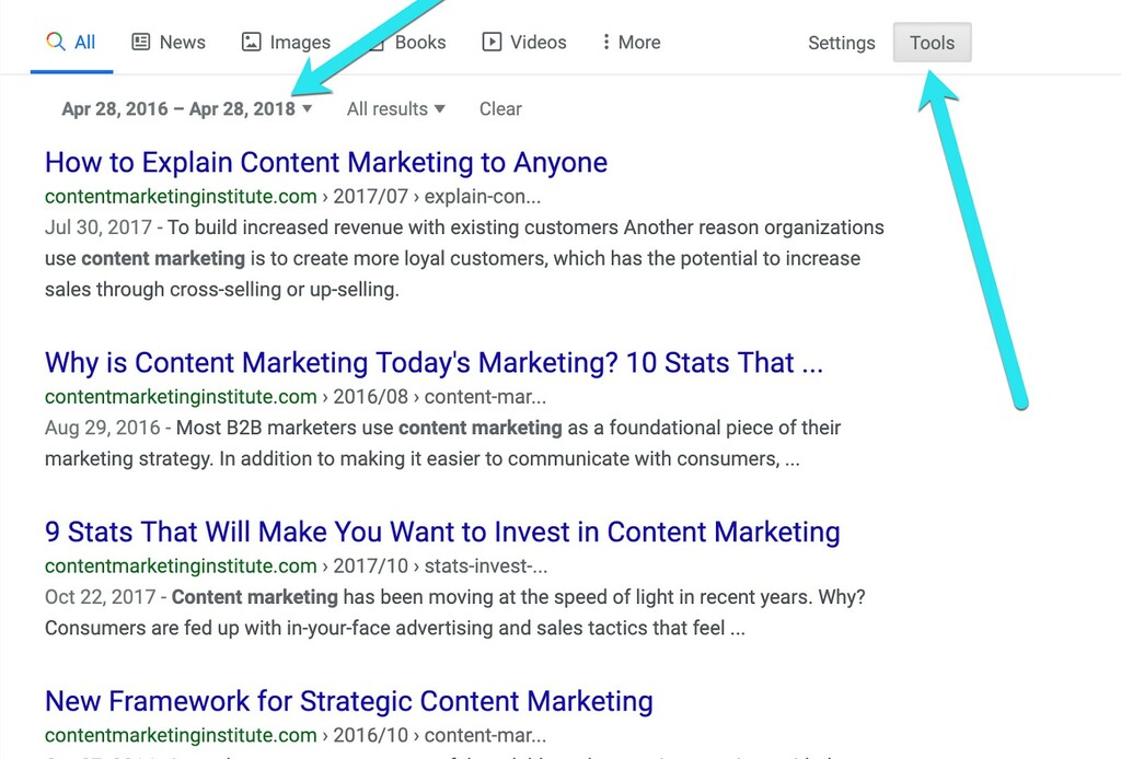 Google offers a variety of searching options to diversify your link outreach tactics. One of my favorite tools is Google’s “Time” search allowing you to filter results to fresher or older documents.