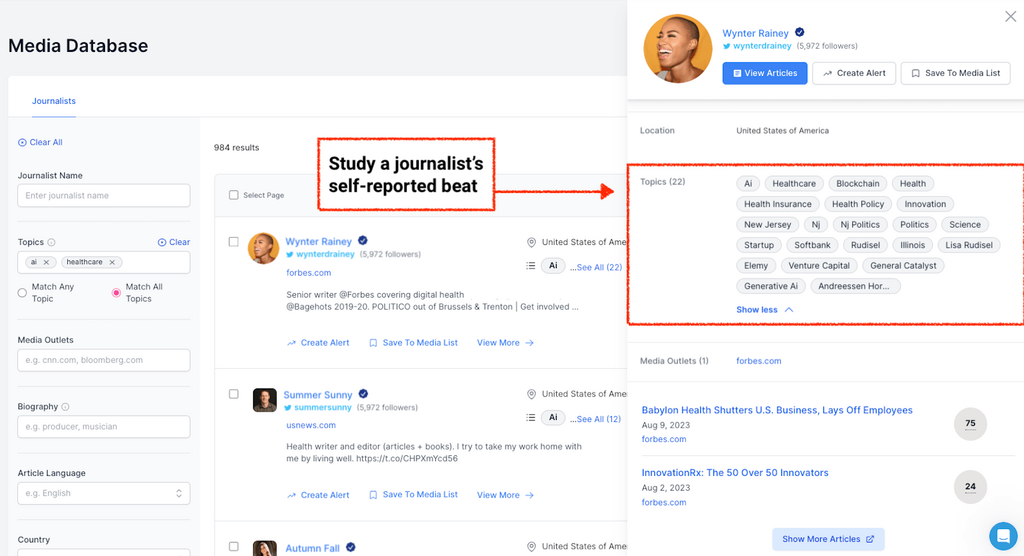 In BuzzSumo’s Media Database you can find journalists writing about 150K+ topics, and expand your chances of landing coverage by tracking down the journalists who write across multiple beats – because if they can't use your story for one publication, they may be able to publish it in another.