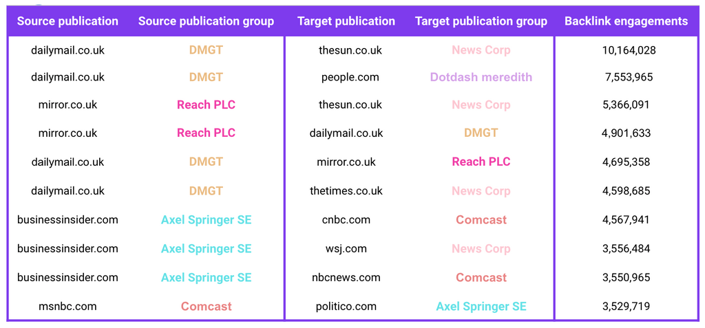 When you look purely at the number of links a family-owned publication earns, Reach PLC (Mirror, Daily Star etc.) takes top spot, racking up 670K backlinks in total across its own network.