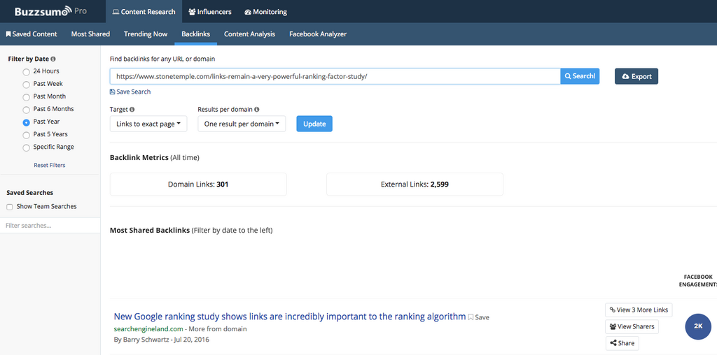 Checking who linked to your article in BuzzSumo’s backlink tool: