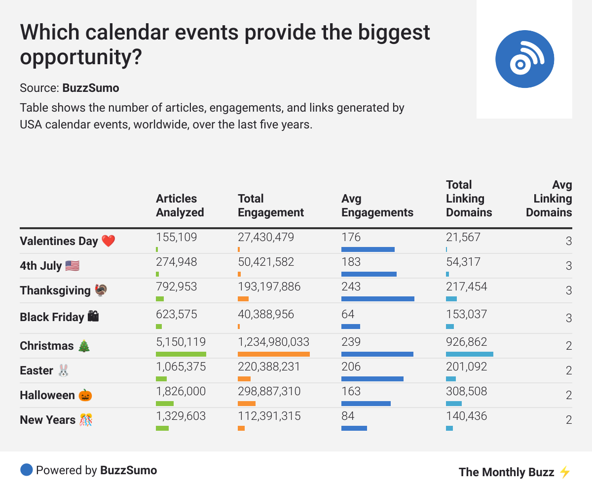 - If you want as many eyeballs on your content as possible, it’s all about Christmas. Christmas sees the highest total engagement, and is published about the most. There is a big, engaged audience here. But, if you’re looking to generate PR, you won’t earn as many links as you could by covering other holidays.