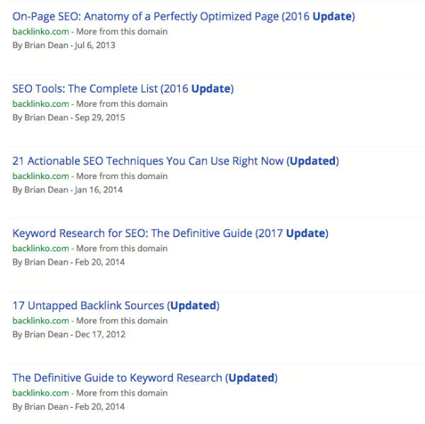 Let’s take another look at some of Brian’s top content. In the six examples below Brian is updating and repromoting his successful content. For example, the top post is a 2017 update of his 2014 SEO Keyword Research Guide.