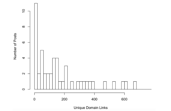 What is even more staggering is the number of unique linking domains. The average per post is 275 and the median is 137. When we looked at a million posts at random we found over 50% did not receive a single link.