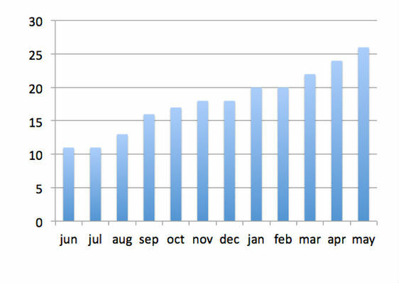 I specifically looked at what I considered to be ‘evergreen’ articles and found a slightly different pattern of link acquisition over time. In the example below 40% of links were acquired in month one but links continued to be acquired slowly but consistently over the next 11 months.