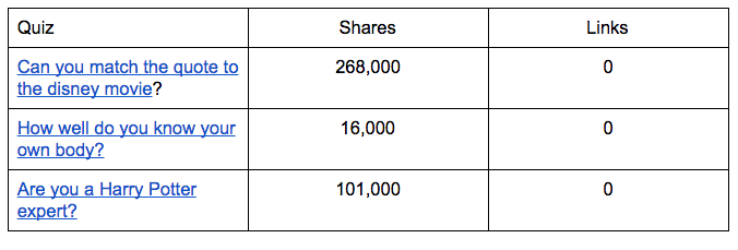 Here are three example quizzes from BuzzFeed which received nearly 400k shares but zero links.