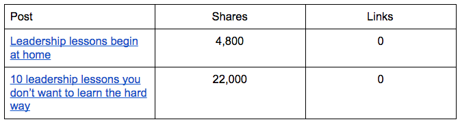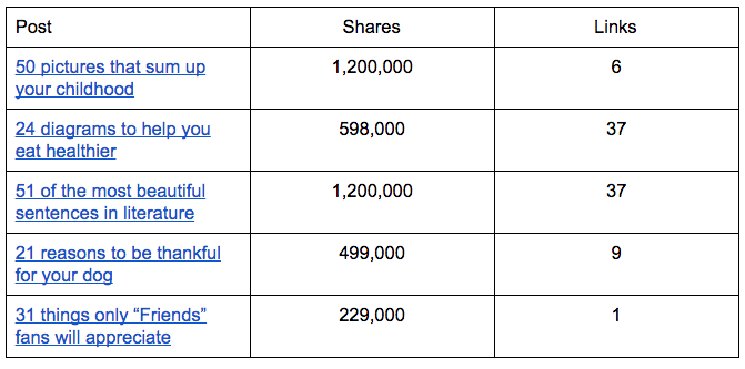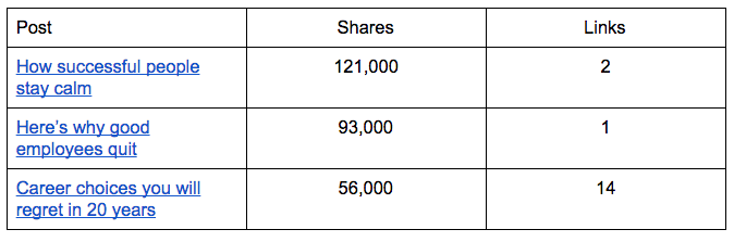 Overall, I did find a positive correlation of +0.3 for LinkedIn content but in many cases the number of links were actually zero. My findings were very similar when I looked at a limited data set of Buzzfeed posts. Here are some examples.
